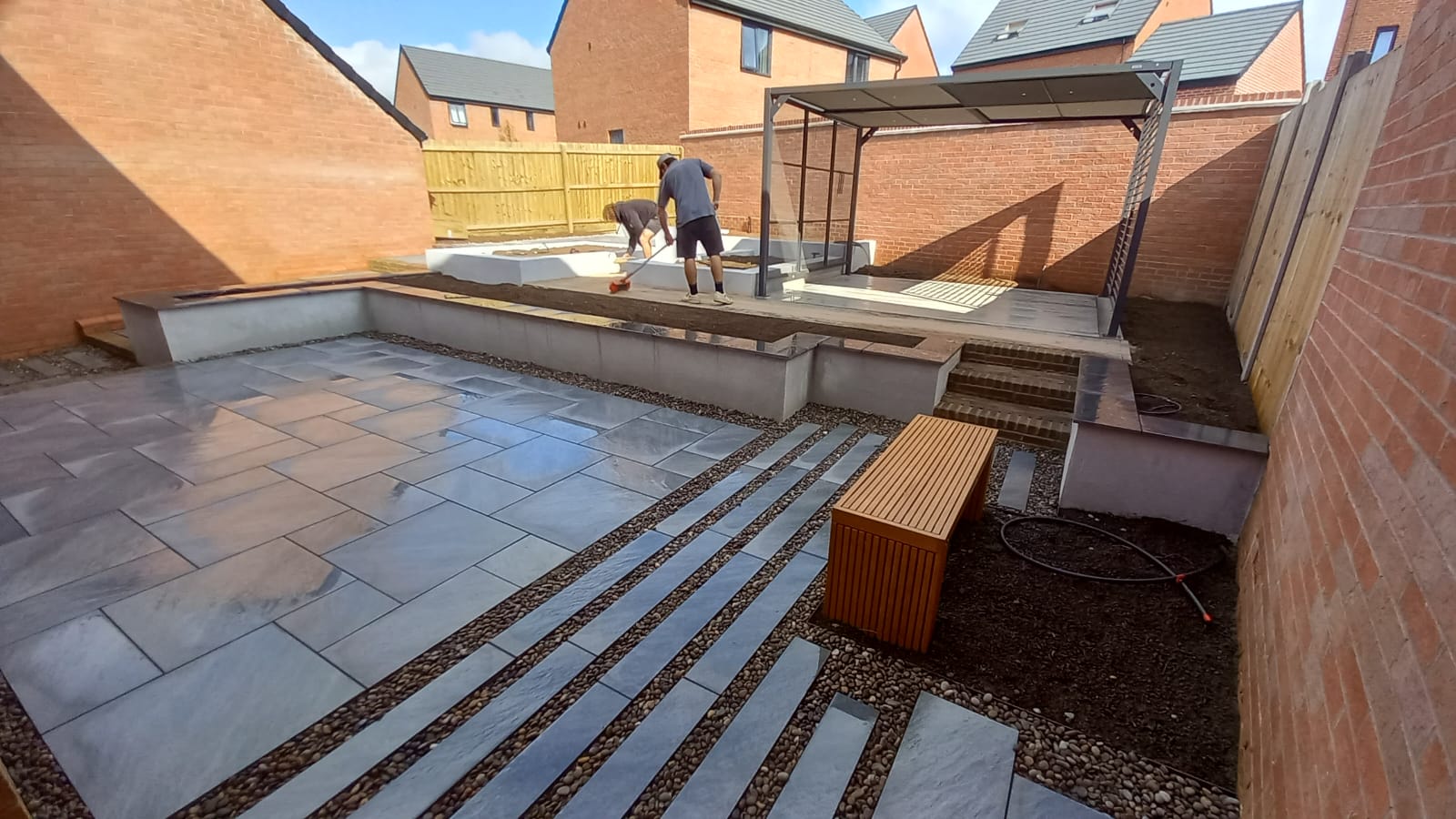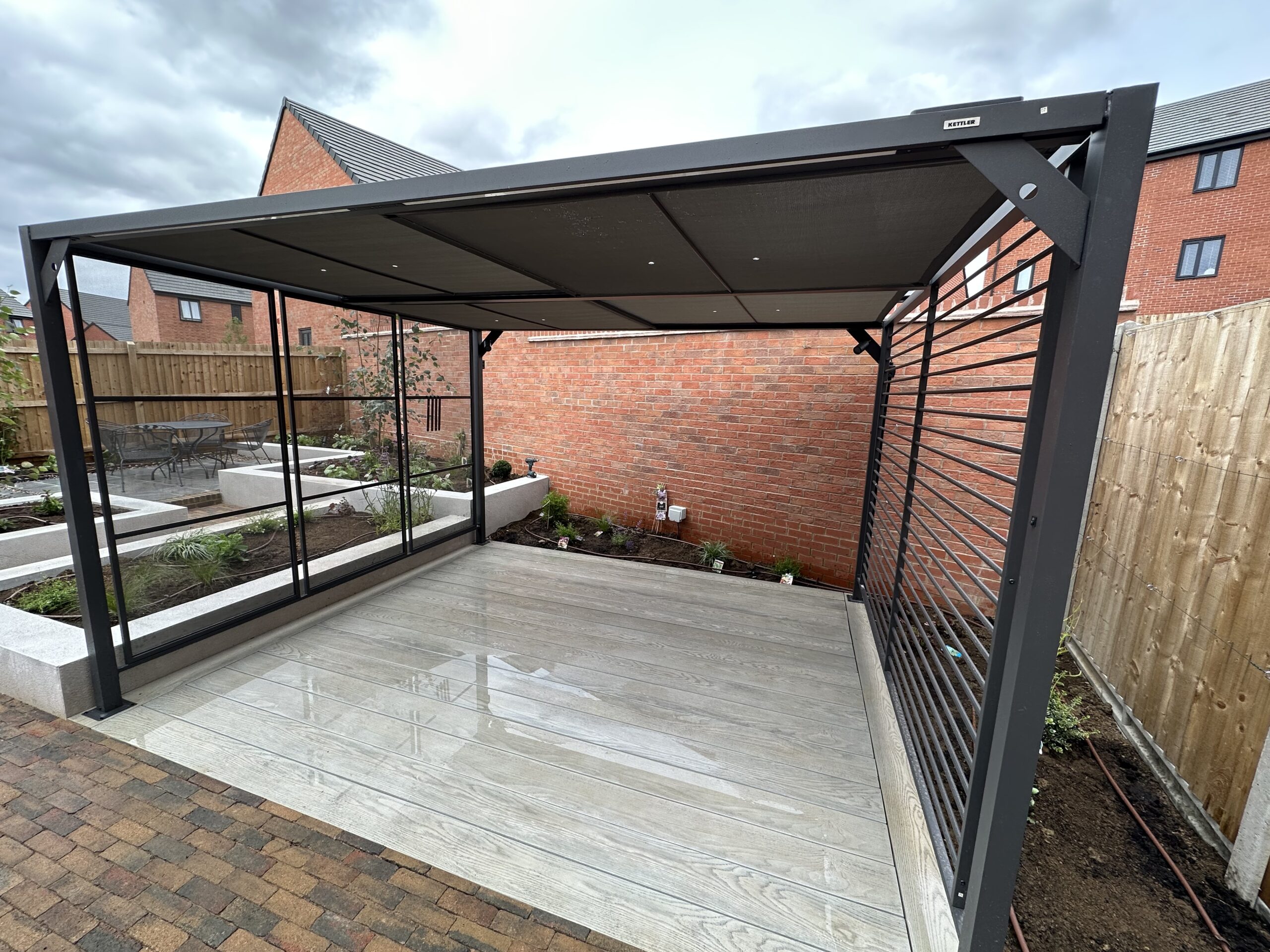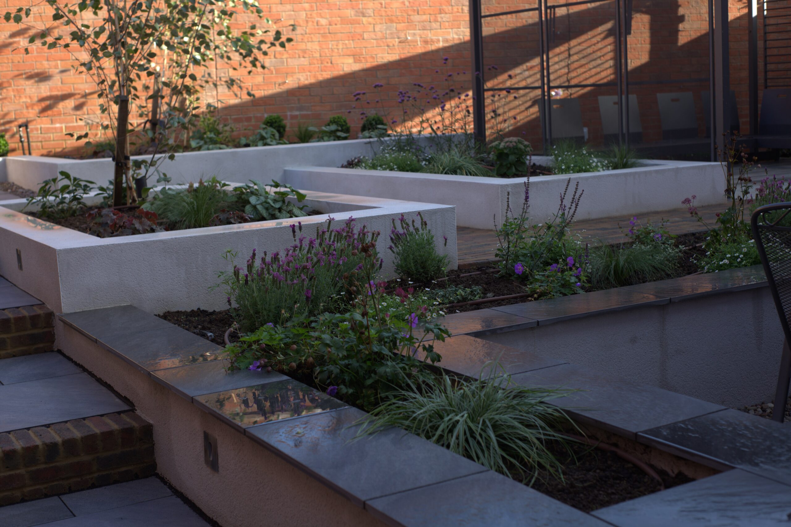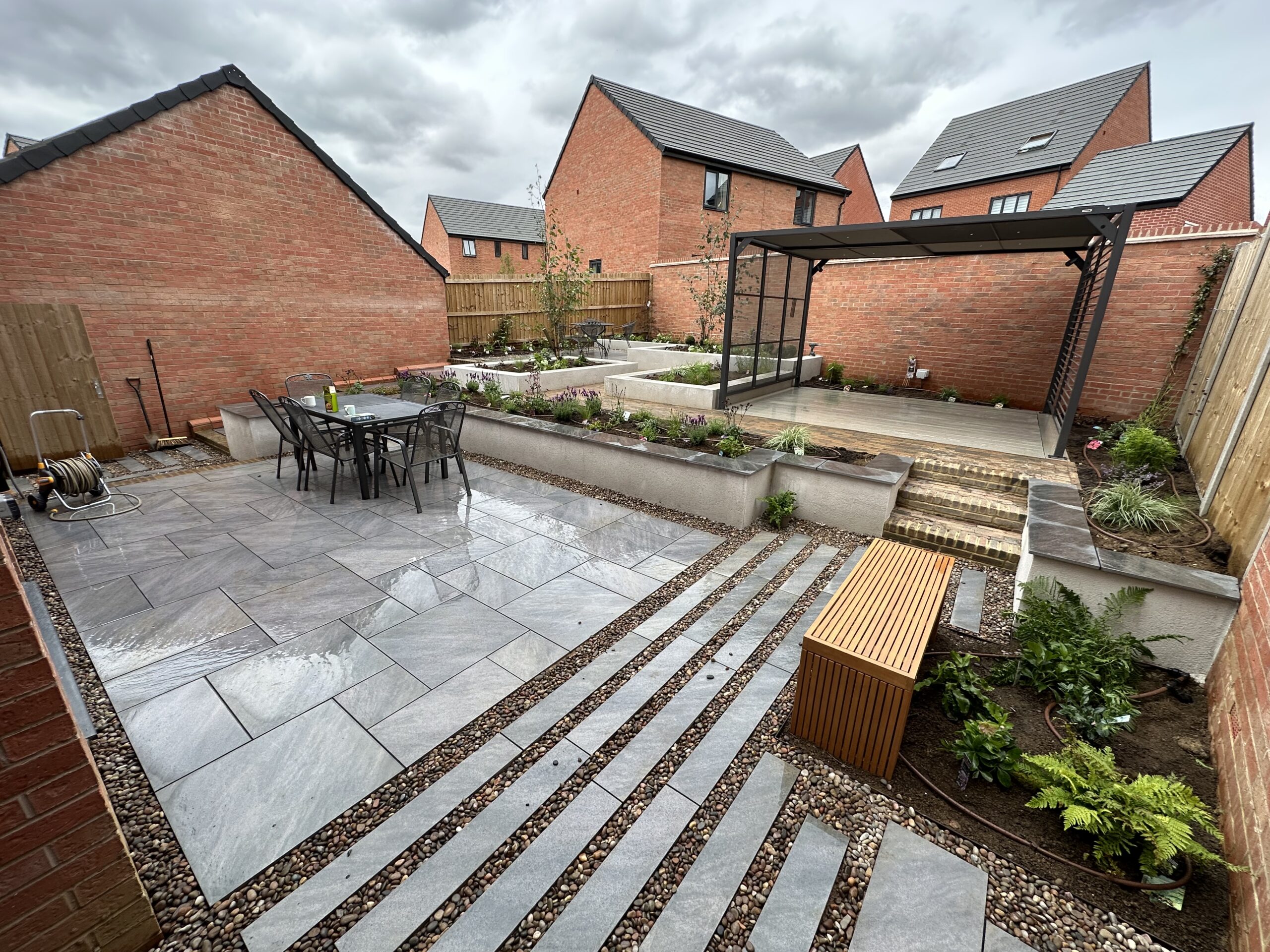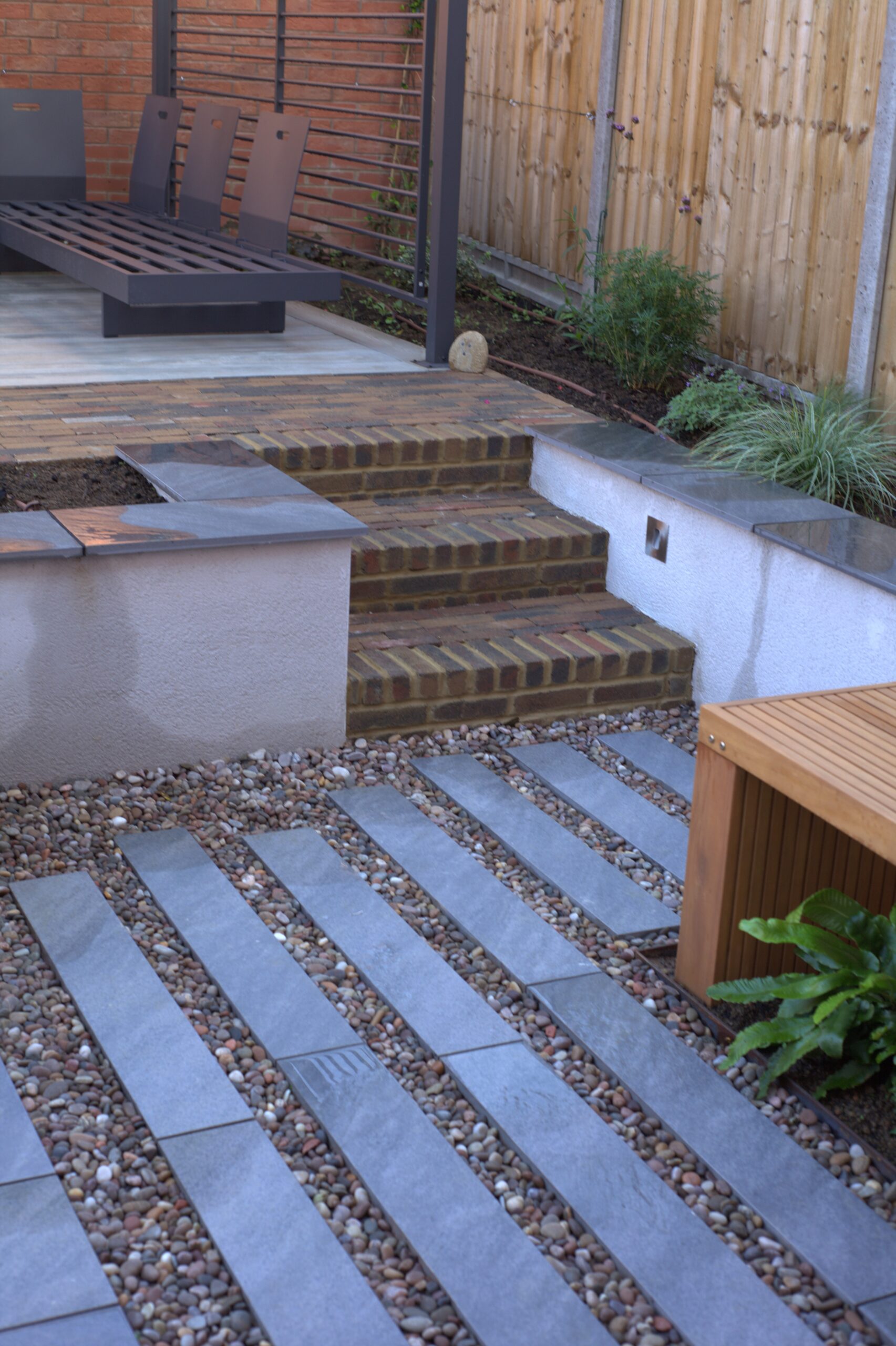 This was a challenging build. The slope meant we had to start the build at the back of the garden, but make sure by the time we got to the house, the levels still worked to the design. There was relatively poor access to the garden; all materials along with lots of garden spoil had to come through through the gap between the garage and the house, which was just under 1 metre wide. The ground is made up as part of the development, so we had to ensure that the foundations for the rendered walls were deep enough to find firm ground, and enough compacted stone was put down to prevent movement of paths and steps in the future. Erecting the customer supplied Kettler pergola was very fiddly, but provided good privacy alongside some strategically placed Silver Birch trees. There was a great mix of modern materials in this job, composite decking, porcelain paving and rendered walls which all combine to great effect. During the build we ensured ducting was in place so that installation of garden lighting and irrigation did not mean unsightly pipes and cables. Lots of forward planning on this job, but a really rewarding build.