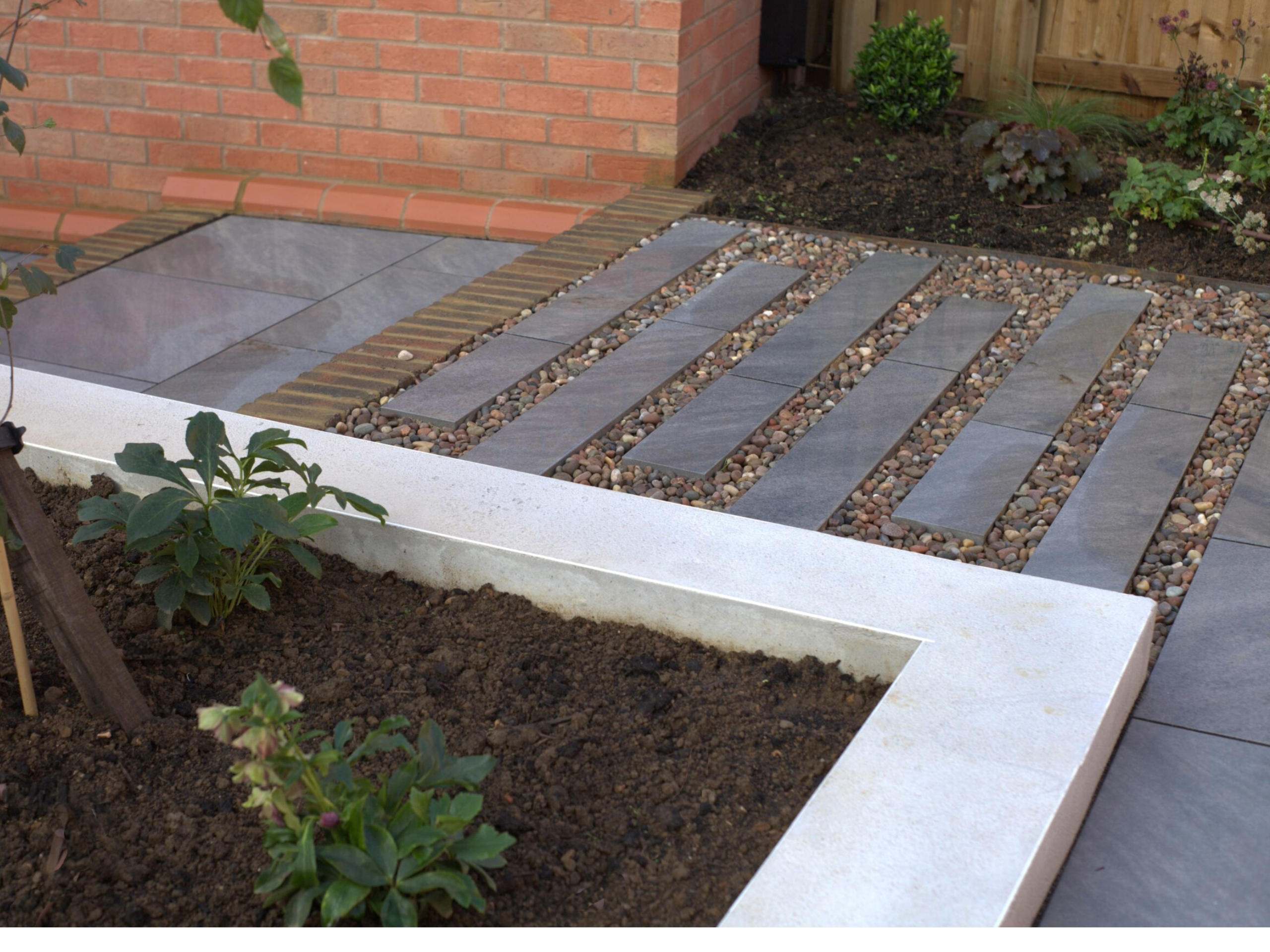 The garden of this north facing new build house had not been developed at all and so was simply a soil canvas, sloping from left to right and rear to house. The clients wanted the garden to be an extension of the house, with varying seating options for different purposes and to accommodate a good number of people.
