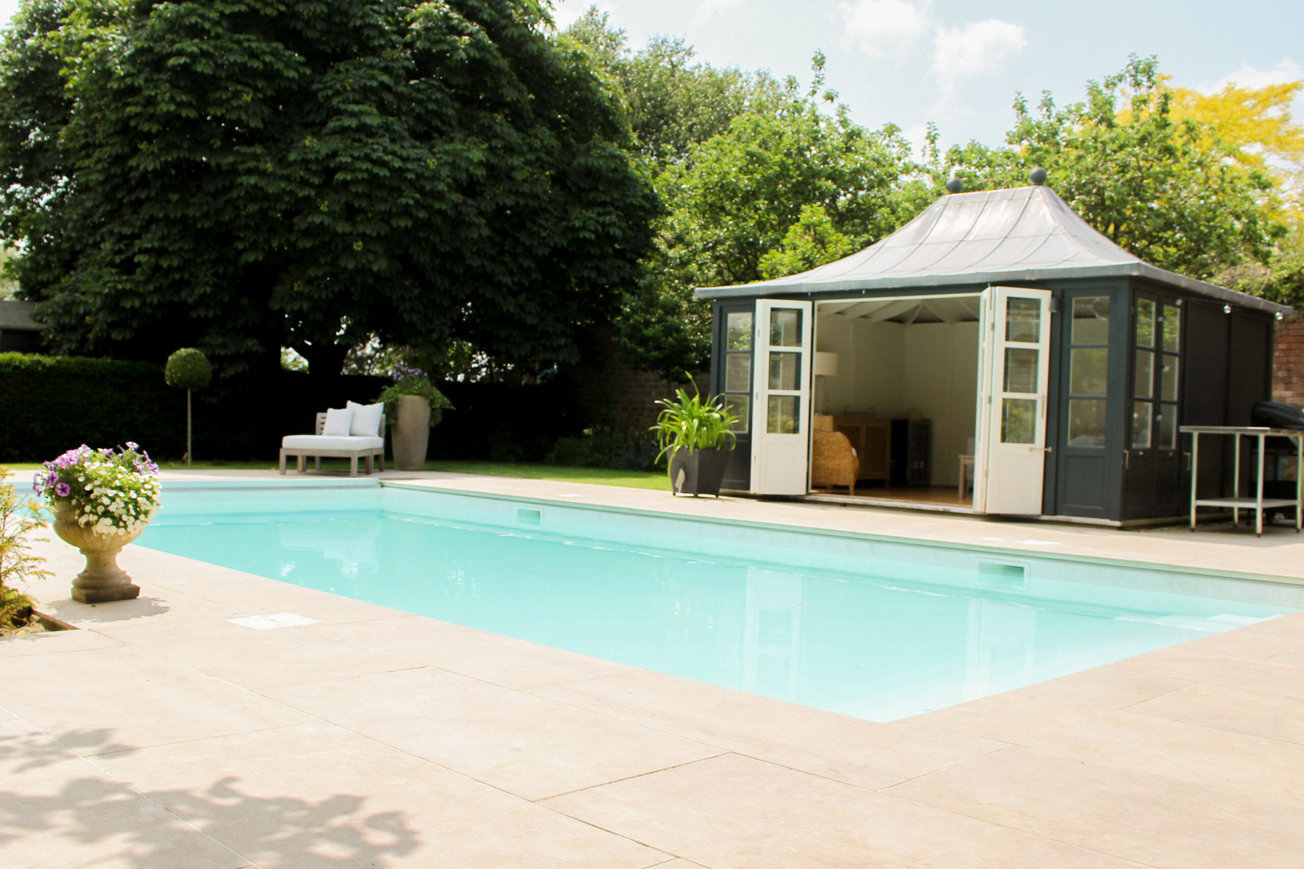 The swimming pool is finished with sleek porcelain paving, chosen for its clean, contemporary look, and detailed with bullnose edging around the internal perimeter to provide a refined, high-end finish. Complementing this, we introduced modern oak sleepers throughout the garden — a nod to traditional materials, but used in a way that adds structure and sophistication.